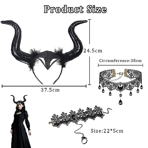 Amebleak 3 Pezzi Cerchietto in Corno,Corna Copricapo,Corna da Regina,Costume Malefica Corna con Gotici Collana in Pizzo e Bracciale,Fascia per Capelli Corna per Decorazione Carnevale Cosplay Donna