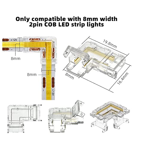 A [luce compatibile] questo accessorio di montaggio è compatibile solo con la luce a banda LED COB larga 8mm (non applicabile alla larghezza di 10mm della tavola e alla luce regolabile CCT LED a banda LED COB). I connettori trasparenti a filo consentono di collegare facilmente un nastro COB con un altro nastro COB con filo senza saldatura.