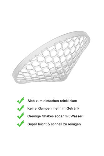 Setaccio extra per frullati cremosi: con il setaccio cliccabile, ora ci sono solo frullati senza grumi. Con il nostro shaker non sono più necessarie fastidiose agitazioni o lunghe miscelazioni. Goditi i tuoi frullati proteici cremosi dopo pochi secondi di agitazione.