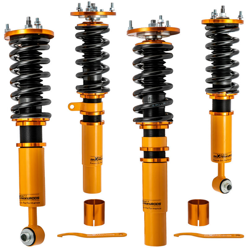 MXR-SNA coilovers are designed as an entry level for street use. It features with full length height adjustable and adjustable camber plates (applicable for some vehicles), which offers you a lowered stance, improved performance for your daily use vehicle. Application: For BMW 5 (E39) (1995-2003) RWD notchback model: 525 i, 530 i, 540 i, 520 d, 520 i, 523 i, 525 td, 525 tds, 528 i, 525 d, 530 d, 535 i Note: Not for Wagon or M5 Models Will not fit Self Leveling/Air suspension model Specification: Top mounts: front - pillow ball top mounts with camber plate rear - rubber top mounts Damping: not available Spring rate Front: 12 kg/mm (672 lbs/in) Spring rate Rear: 9kg/mm (504 lbs/in) Spring length Front: 190mm Spring length Rear: 190mm Adjustable height: lowering 1-3inch Coilover overall length Front: 490mm-540mm Coilover overall length Rear: 520mm-605mm Shock type: Twin tube Spring preload: 7-10 mm Color: gold Feature: 1. Lowered height adjustment from 1''-3'' which allow lower center of