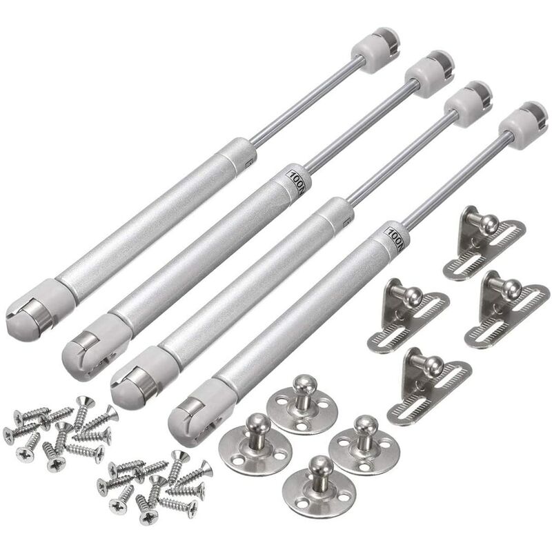 Materiale: la staffa della molla a gas è realizzata in robusta plastica ABS e lega di zinco, che è antiruggine e molto resistente. Materiale superiore per l'albero, ad alta resistenza, durevole e pratico Forte pressione del gas - Il supporto di pressione di ciascuna molla può raggiungere 100 N (10 kg), cilindro del pistone riempito con gas inerte - azoto, compressibilità, stabilità e sicurezza Supporto elastico - Adotta un sistema idraulico per un facile funzionamento, ammortizzatore a pieno stadio e buona tenuta senza perdite d'olio. Installazione stabile: facile da installare, durevole e stabile. Il supporto a gas di sollevamento è adatto per armadi, credenze, ante di mobili, ecc. Scenario applicabile - Adatto a qualsiasi tipo di porta in PVC, alluminio o legno;