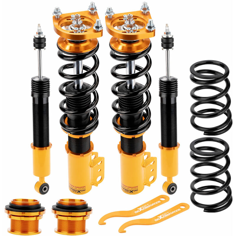 Per Ford Mustang 94-04 Adjustable coilover details Fit for For FORD Mustang Base SN95 Convertible/Coupe 1994-2004 For FORD Mustang GT SN95 Convertible/Coupe 1994-2004 Specification * Quantity: 2 pieces front + 2 pieces rear + 1 Spanners * Spring rate Front: 8 kg/mm (448 lbs/in) * Spring rate Rear: 9 kg/mm (504 lbs/in) * Adjustable damper: 24 ways adjustable damper * Adjustable height: Yes * Adjustable camber plate: Yes Attention As it is high performance coil over, few modification might be required for some vehicles Feature * Adjustable ride height * Adjustable pre-load spring tension * 24 levels of adjustable damper -- This allows you the ability to perfectly dial in your coilovers system. For a nice comfortable driving, set damping to full soft. For more spirited driving, set it to 16 clicks. For occasional track days, set it to full stiff. * Pillow ball top mount -- this design helps combat noise while tuning. It also improves the steering feel and response * Most components are