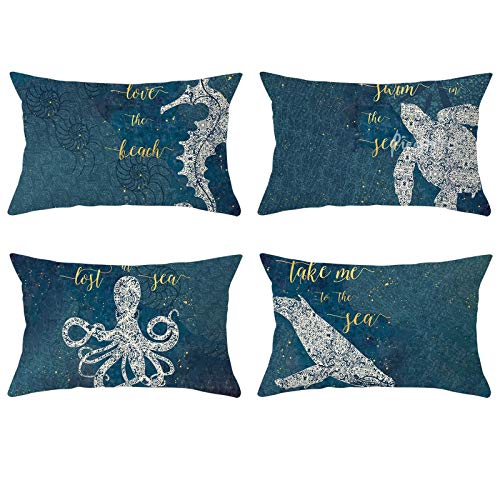 Amody 4 Pezzi Federe Cuscini Divano, Federe 30x50cm Ippocampo Tartaruga di Mare Polpo Balena Fodere Cuscino per Divano, Letto, Patio, Divano Blu Set 3