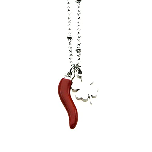 collana portafortuna con corno rosso e quadrifoglio acciaio smalto catena fino a cm 50 cln0139