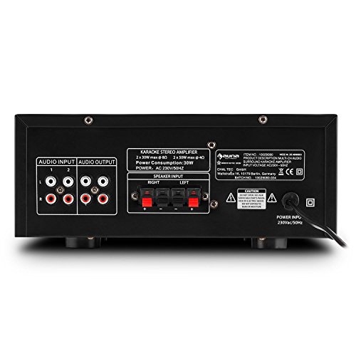 Amplificatore HiFi compatto con 100 Watt max. di potenza a 4 Ohm | Sezione karaoke con due ingressi per microfono, controllo volume separato, equalizzatore a 2 bande ed effetto Echo | Ingresso USB-MP3 e SD per riprodurre la musica da chiavette USB, lettori MP3 e schede di memoria SD