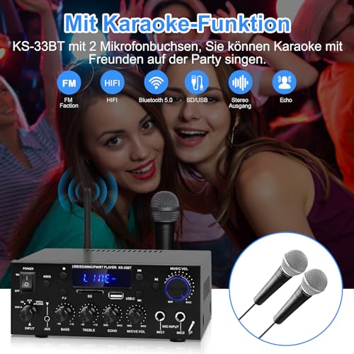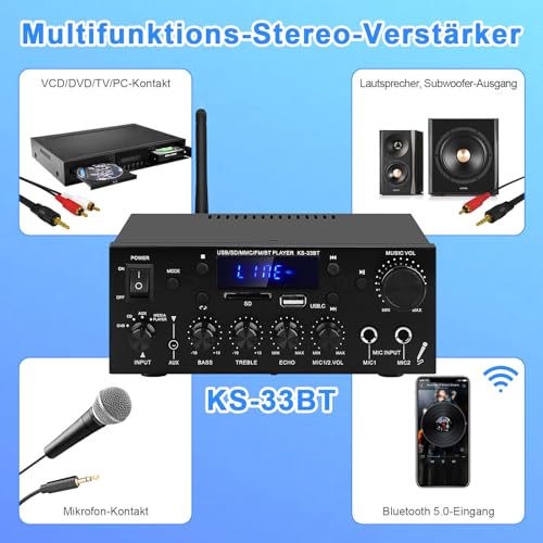 Amplificatore Audio Casa,Bluetooth 5.0 HiFi Amplificatore,KS-33BT 2Canali RMS 60W X 2 Max 400W X 2 Amplificatore Stereo Ricevitore W/Echo, USB/SD/AUX/BT.C/FM Microfono per Home Cinema Auto, Festa
