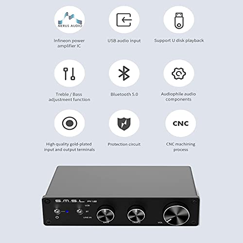 SMSL Amplificatore audio stereo A12 Bluetooth 5.0, mini HiFi Class D, integrato a 2 canali per altoparlanti Home con bassi e controllo treble 80 Wx2 Infineon's MA12070