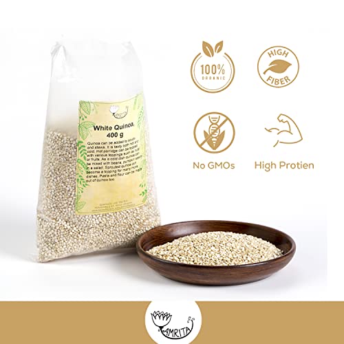 AMRITA Quinoa Bianca per Dieta Sana - Sostituto Integrale Naturale del Riso Biso Bianco - Riso Quinoa per Porridge Caldo, Insalate, Zuppe - Semi di Chinoa per Germogli, Preparare Farina, Pasta - 400g