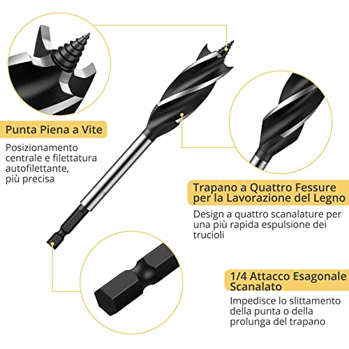 【Design Quattro-Lama】Questo Set di Punte da Trapano, Caratterizzato da un Design a "Quattro Lame", Consente un'Espulsione Più Rapida del Truciolo e La Sua Punta a Vite Completa Garantisce Facilità d'Uso e Trazione.