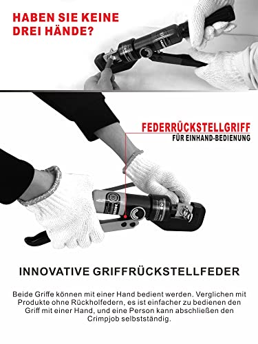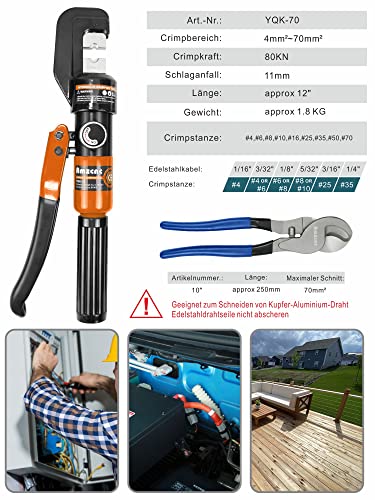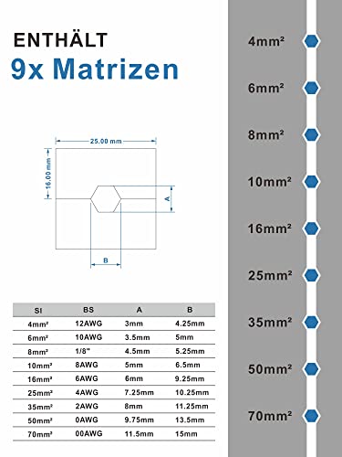 9 set di inserti a crimpare in acciaio (4-70 mm²: 4/6/8/10/16/25/35/50/70 mm²), l'ingrandimento della superficie interna del pistone rende la forza più uniforme e non facile da deformare. La gamma di crimpatura dei capicorda in rame: 4-70 mm². Intervallo di crimpatura dei capicorda in alluminio: 4-50 mm². Perfette dopo la sala. Tutti i prodotti sono testati doppiamente. In caso di domande, si prega di contattare il servizio clienti. Offriamo un perfetto servizio post-vendita.
