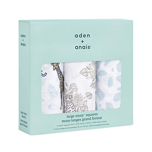 Aden + anais Musy Squares - Jungle, confezione da 3 | grande tessuto in mussola di cotone 100% | morbido e leggero unisex per neonati | Panni per neonati e ragazzi | Ideale