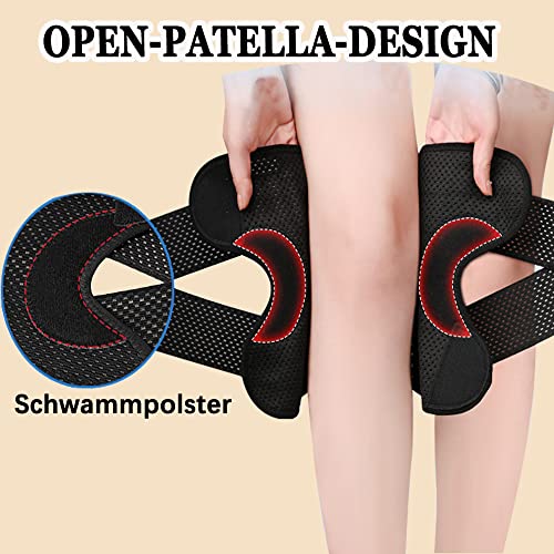 Design innovativo, supporto confortevole: le curve su entrambi i lati della ginocchiera sono progettate ergonomicamente. La parte centrale della rotula è aperta, il che consente alla fasciatura del ginocchio di adattarsi perfettamente all'articolazione del ginocchio. Migliora le carenze di prodotti simili, due cinghie di compressione regolabili a forma di V accuratamente progettate, non facili da far scorrere, puoi regolare la tenuta in base alla tua scelta.