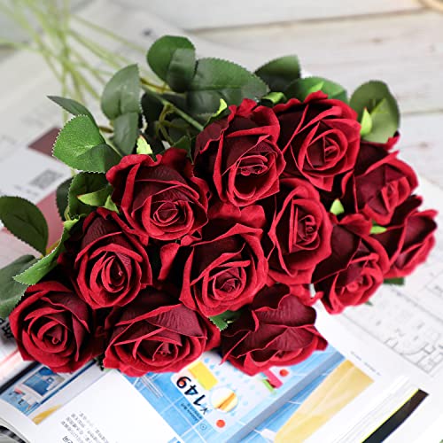 Anaoo 12pcs Rose Fiori Artificiali Rosa Fiore Finta di Seta Artificiale Singolo Bouquet da Sposa Decorazione Fiori di Nozze Feste Giardino Ufficio Centrotavola per Domestica Matrimonio, Borgogna