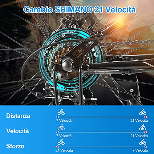 Bici Elettrica da Pendolarismo Aggiornata: cerchi in lega di alluminio a doppio strato, sistema di trasmissione professionale Shimano a 21 velocità, freni a disco meccanici anteriori e posteriori affidabili, display a LED, fari e catarifrangenti. Tutto in uno per una guida sicura. Il telaio delle sospensioni anteriori e posteriori facilitava il superamento degli ostacoli.