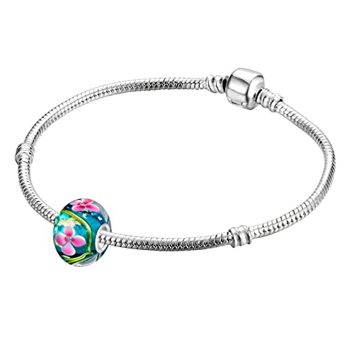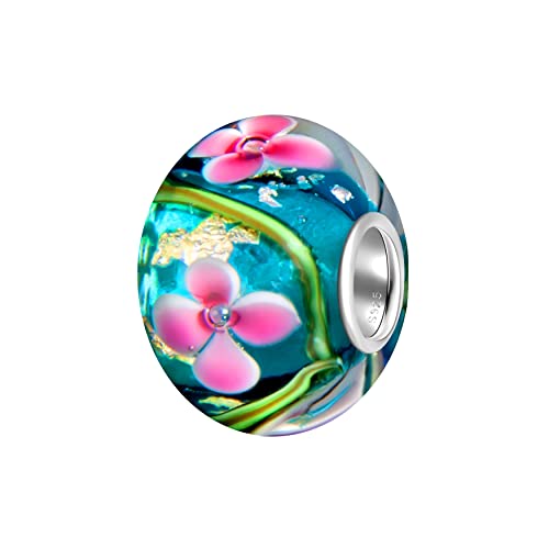 Andante-Stones Argento massiccio Sterling 925 originale, Perlina di vetro Bead SEALIFE color mare con fiori rosa e bianchi Elemento Pallina per perline European Beads + Sacchetto di organza