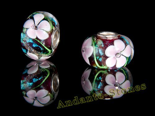 Andante-Stones Argento massiccio Sterling 925 Perlina di vetro Bead SEALIFE con fiori color mora, rosa e turchese. Ciondolo da donna Charm per bracciali e collane europei + Sacchetto di organza