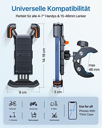 [Robusto come corazzato] Il supporto per cellulare da bicicletta ha superato il test di robustezza secondo gli standard militari SGS e il collo del morsetto del manubrio è realizzato in acciaio inossidabile, quindi non dovrete più preoccuparvi che il supporto si rompa. Anche se dovete cavalcare in montagna, la stabilità del supporto per cellulare è insuperabile. Anobil vi accompagnerà per godersi il viaggio.