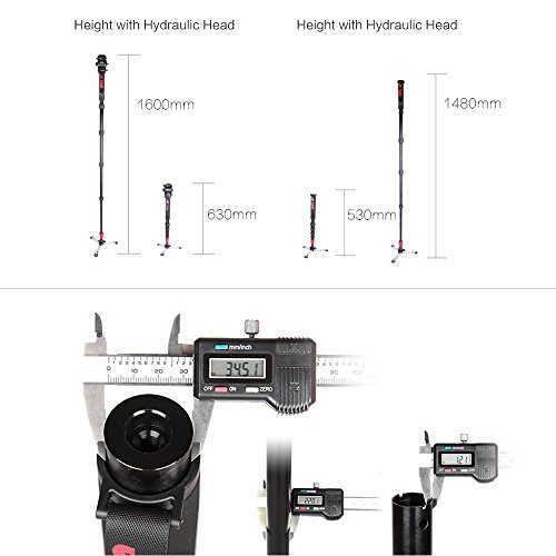Manicotto di filo di metallo, rotazione 1/4 cerchio verso sinistra per allentare rapidamente il pulsante di blocco. 5 sezioni regolabili in altezza, max. Altezza di lavoro di 1600 mm, altezza di lavoro min. 630 mm. Il tubo del monopiede è fatto di lega di alluminio di alta qualità, lavorazione CNC di precisione. Molto squisito e durevole.