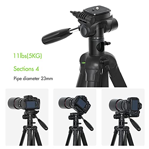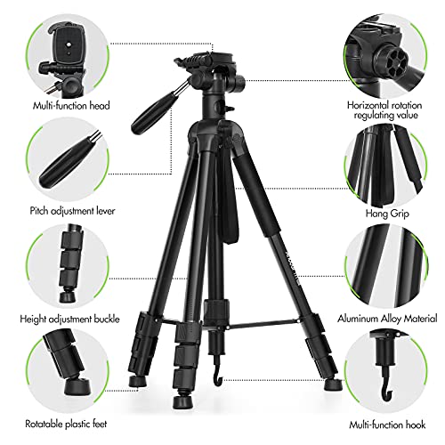 Treppiede ad ampia compatibilità: la capacità di carico di 5 kg/11 libbre e il design del connettore a vite standard da 1/4 di pollice rendono il treppiede compatibile con la maggior parte delle fotocamere DSLR, DV, fotocamere digitali, videocamere, supporti per telefono, ecc. Viene fornito con un supporto per telefono e un otturatore remoto per telefono.