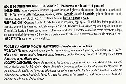 Preparazione: versare il contenuto della busta in un recipiente, aggiungere 250 ml di latte freddo parzialmente scremato . Montare il tutto con una frusta elettrica per 4/ 5 minuti.