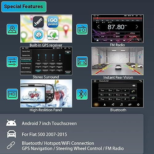Android Autoradio per Fiat 500 (2007-2015) con GPS Bluetooth Stereo Auto Radio con Schermo 7 Pollici Touchscreen con FM Supporto WiFi/Mirror Link/USB/SWC Retrocamera+Canbus