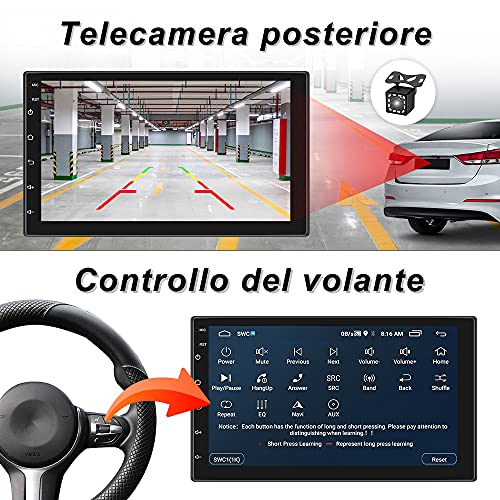 【Telecamera di retromarcia e controllo del volante】 L'autoradio doppio din android include una telecamera di backup a 12 LED, si collega alla telecamera di backup, l'autoradio può essere collegata alla retromarcia per passare automaticamente. L'autoradio Android supporta il controllo del volante (SWC), che controlla comodamente il volume dell'interruttore, i brani e i canali radio tramite i pulsanti sul volante.