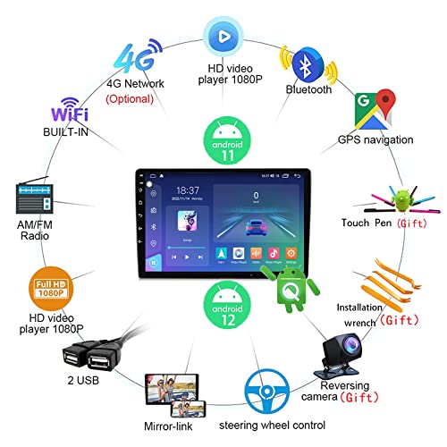 * Multi-funzioni Sat Navi: radio satellitare integrato MIC, supporta GPS/Bluetooth 4.0/5.0/5.1 (musica e chiamate hands-free)/WLAN/4G/5G/1080P video/uscita RCA completa/USB/più grande IPS touch screen/connessione a specchio/controllo del volante/immagine di inversione/informazioni del veicolo/Multi-lingua/Plug and play, supporta DVR esterno/TPMS/OBD2/DAB+/Carplay/Dash Cam, ecc. (opzionale). Macchina fotografica posteriore + penna touch screen + strumento di installazione e rimozione (4PC) - chia