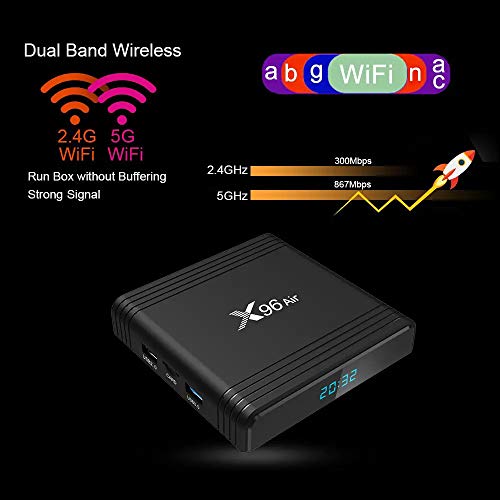 【 2 GB di RAM + 16 GB di ROM con USB 3.0】 Dotato di una RAM da 2 GB e di un'enorme ROM da 32 GB per garantire che i programmi applicativi possano essere eseguiti e memorizzati in modo fluido e rapido, evitando anche che il set-top box TV non funzioni normalmente a causa della memoria insufficiente e della lenta velocità di elaborazione. X96AIR TV box può essere collegato con dischi rigidi, dischi flash USB e schede TF. Grazie alla sua USB 3.0, la cui velocità di trasmissione è 10 volte più veloce di quella di USB 2.0.
