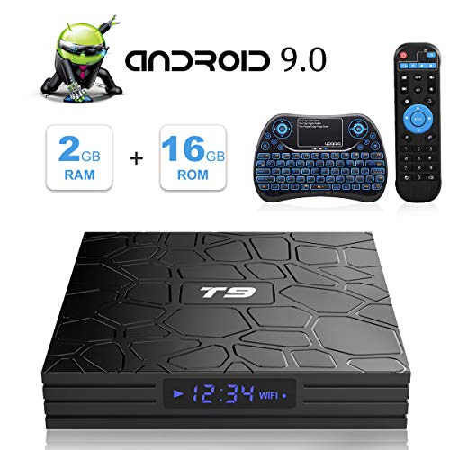 Android 9.0 TV BOX con Mini tastiera wireless retroilluminata, Smart Box T9 con 2GB RAM 16GB ROM RK3318 Quad Core 2.4GHz/5GHz Dual Band WiFi 4K Risoluzione H.265 Bluetooth 4.0 USB 3.0
