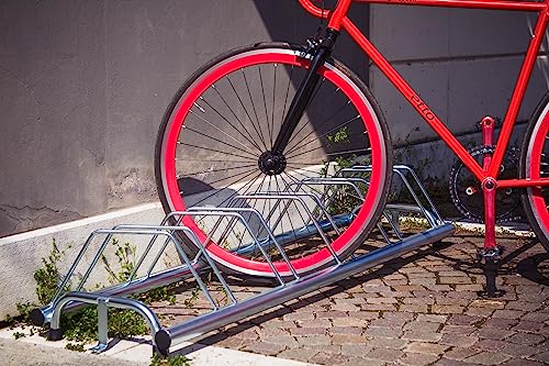 ANDRYS - Rastrelliera Porta Biciclette a Terra da Esterni e Interni 5 posti, Posteggio Alto e Basso, anche per Bici con Freno a Disco, con Tappi in Pvc Neri, in Acciaio Zincato a Freddo, Colore Argento, 140 x 42 x 41 cm