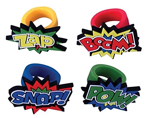 Confezione da 12 anelli in silicone a tema super eroe pop art per feste per bambini.