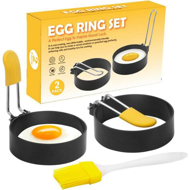 MULTI-FUNZIONE - L'anello per la produzione di uova è più di un anello per friggere le uova, preparare muffin inglesi, frittelle, frittate, bagel o qualsiasi cosa tu possa immaginare. Ora inizia la giornata perfetta con una colazione soleggiata! ALTA QUALITÀ - I nostri anelli per friggitrice per uova in acciaio inossidabile di sicurezza per la tua piastra sono realizzati con materiali di alta qualità privi di BPA. DESIGN UNICO - I nostri anelli per uova sono progettati con un grande manico in silicone per evitare ustioni, puoi estrarre facilmente gli anelli della friggitrice dalla padella. Il manico pieghevole è anche facile da riporre. FACILE DA PULIRE E LAVABILE IN LAVASTOVIGLIE - Basta uno strofinaccio e un po' di detersivo liquido per piatti, puoi pulire facilmente questi anelli a forma di uova, metterli anche in lavastoviglie un buon modo. FACILE DA USARE - il pennello extra per olio in silicone lo rende più facile da usare, basta applicare un po' di olio sulla parete interna
