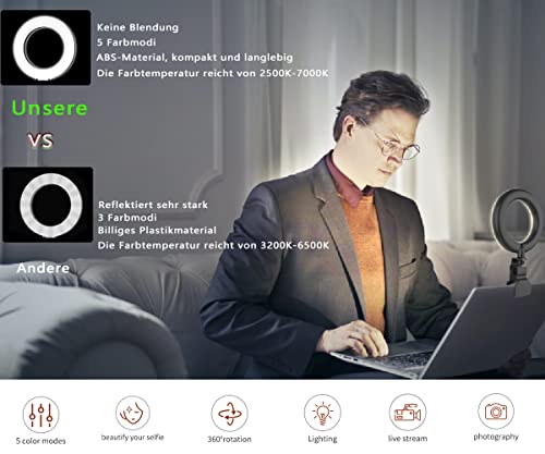 Luce ad anello per computer portatile, luce per videoconferenza, 5", resistente, per selfie per streaming video, videochiamate, Tiktok, riunioni, trucco, 5 modalità di illuminazione e 10 luminosità