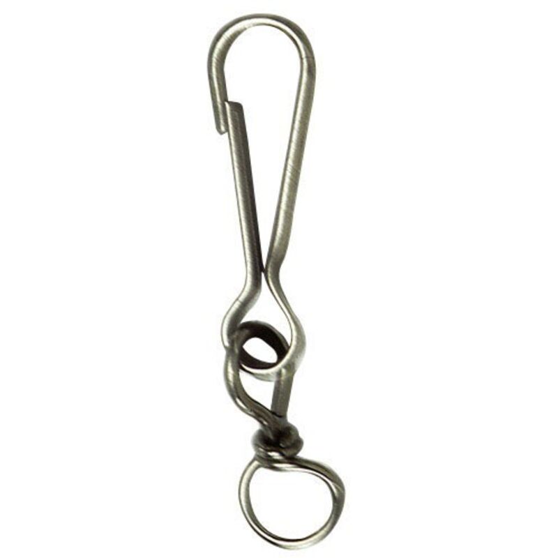 Moschettone ad anello girevole nichelato. - Misura: 70 mm. - Anello girevole. - Colore nichel. - È noto anche come moschettone a filo, moschettone con moschettone.