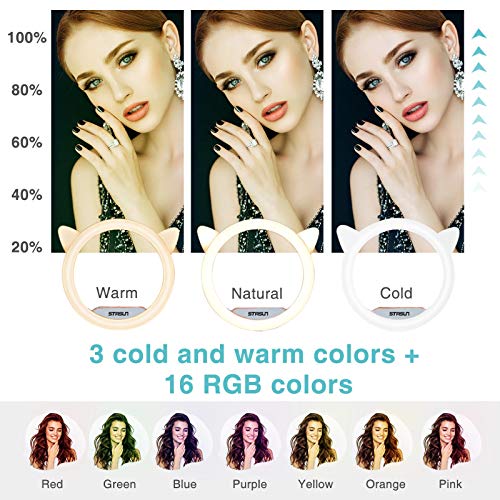 RGB Luce Anulare】Dotato di 202 LED, temperatura di colore da 2800 K a 5500 K. Bianco/bianco caldo/giallo caldo, rosso, verde, blu, viola, arancione, giallo, rosa, modalità di respirazione & lampeggio e ogni modalità ha 10 livelli di luminosità, 64 opzioni in totale con un range di dimmerazione di 10% -100%.
