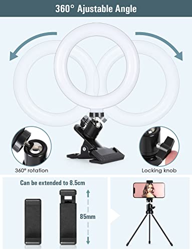 Anello luminoso da 16.3 cm per selfie, per computer portatile, 5 in 1 anello luce led con treppiede, clip, clip per telefono, testa a sfera, 3 modalità e 10 dimmerabili, streaming live, riunioni