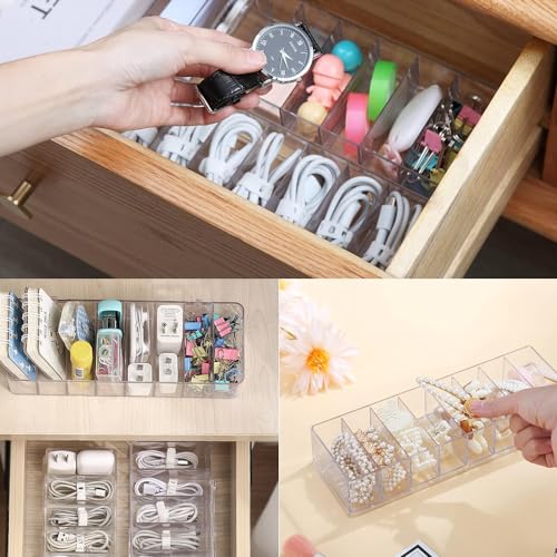 【 Dimensioni 】 La dimensione della scatola di gestione dei cavi è di circa 26 x 9,5 x 5,5 cm ed è composta da 8 scomparti. Ogni scomparto può contenere oggetti in categorie. Il design del coperchio può essere impilato per riporlo, risparmiando più spazio.