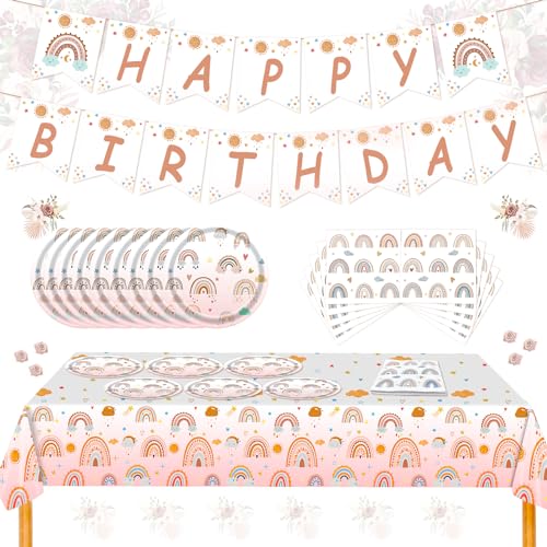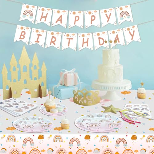 Anevios 56 Pezzi Set Stoviglie Compleanno Arcobaleno Stoviglie per Feste di Compleanno Boho Forniture Piatti Tovaglioli Bandiere per Compleanno Tovaglia per Feste Baby Shower