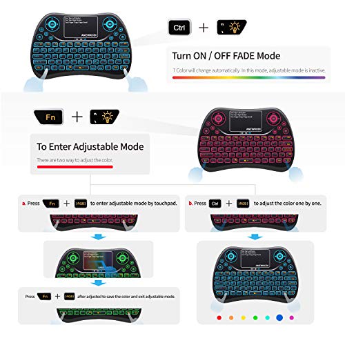 La mini tastiera T2 ha una bella retroilluminazione a LED in sette colori, per una perfetta fluidità anche di notte. Può sostituire il telecomando e meglio del telecomando, perfetto come tastiera QWERTY, Multi-Touchpad e mouse.