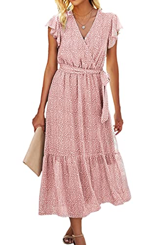 Angashion Abiti da donna Manica corta Wrap V Collo Volant Floreale Stampato Midi Abito con Cintura, Rosa, XL