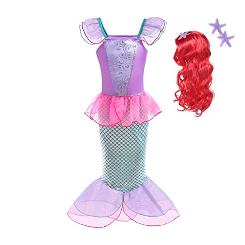 Bellissimo costume da ariel in maschera da principessa sirena per bambine e bambine. 2 set di accessori a tua scelta per completare il look! (Set di parrucche per capelli / Set di accessori da 5 pezzi con corona, guanti, bacchetta, collana e orecchini) Colore: rosa acceso / viola