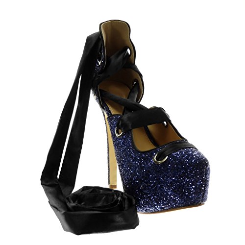 ANGKORLY - Scarpe Moda Decollete con Tacco Sandali Stiletto Decollete Disco Donna Lacci in Raso Paillette Tacco Stiletto Alto 14.5 CM - Blu G89-9 T 40
