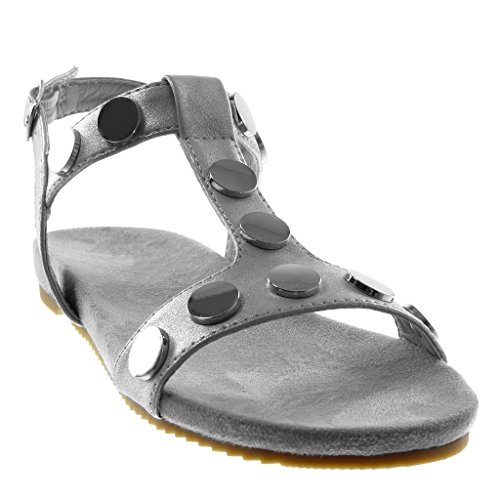ANGKORLY - Scarpe Moda Sandali Cinturino-T Cinturino alla Caviglia Donna Tanga Borchiati Metallico Tacco Blocco 3 CM - Argento 11 F2337 T 38