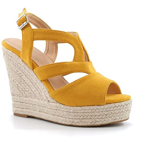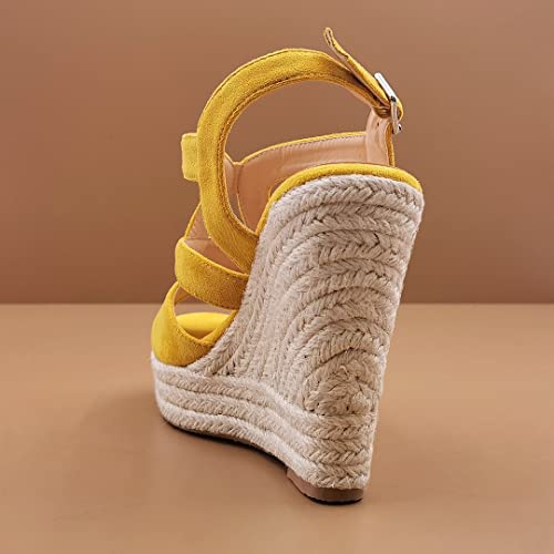 ANGKORLY - Scarpe Moda Sandali Espadrillas Boemia Glamour Romantico Donna Tanga Fibbia con Paglia Tacco Zeppa Piattaforma 12.5 CM - Ingiallimento 4 BL316 T 37