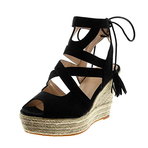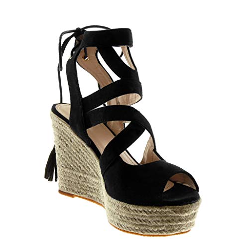 ANGKORLY - Scarpe Moda Sandali Espadrillas Peep-Toe Zeppa Donna Corda Merletto Multi-Briglia Tacco Zeppa Piattaforma 11 CM - Nero 4 L2616 T 37