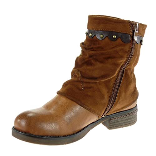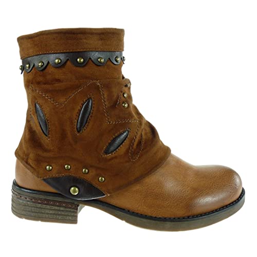 ANGKORLY - Scarpe Moda Stivaletti Scarponcini Biker Cavaliere bi-Materiale Donna Borchiati Finitura Cuciture Impunture Fantasia Tacco Blocco 3 CM - Cammello F2259 T 39