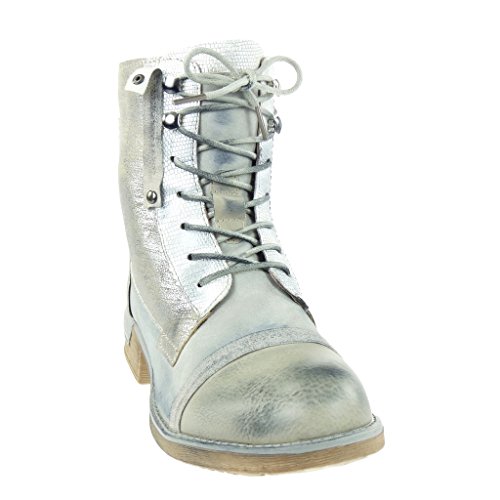 ANGKORLY - Scarpe Moda Stivaletti Scarponcini Rangers Biker Donna Lucide Pelle di Serpente Borchiati Tacco a Blocco 3 CM - Soletta Foderato di Pelliccia - Argento F1228 T 37