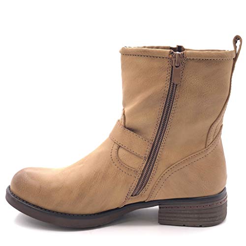 ANGKORLY - Scarpe Moda Stivaletti Scarponcini Stivali - Scarponi Biker Donna Fibbia Tanga Tacco a Blocco 3 CM Leggermente Foderato di Pelliccia - Cammello 2 C381 T 36