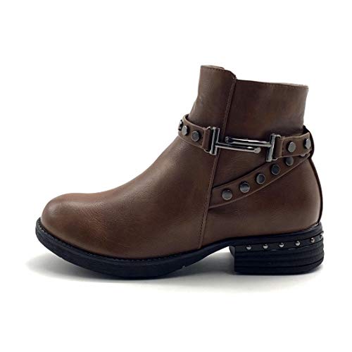 ANGKORLY - Scarpe Moda Stivaletti Scarponcini Stivali - Scarponi Biker Roccia Biker Donna Cinghie Incrociate Borchiati Dettaglio in Metallo Tacco a Blocco 3.5 CM - Marrone C394 T 39