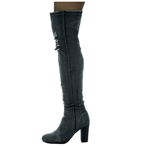 ANGKORLY - Scarpe da Moda Stivali Alti Cavalier Jeans Denim Flessibile Donna Strappati Tacco a Blocco Tacco Alto 8.5 CM